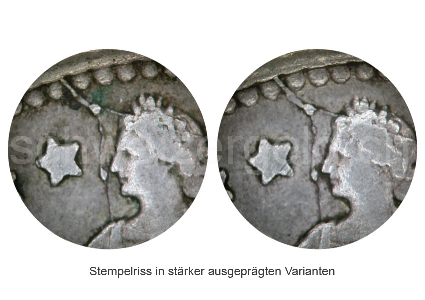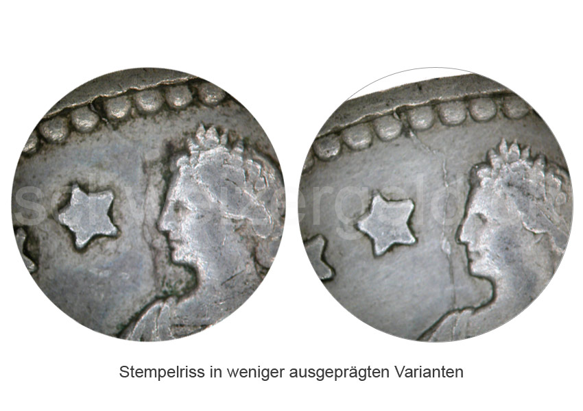 Stempelriss vor dem Gesicht von der linken Schulter bis zum Münzenrand.