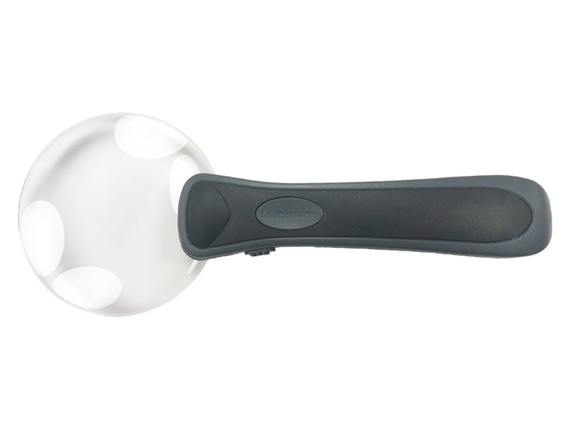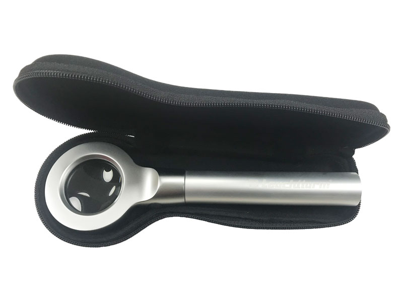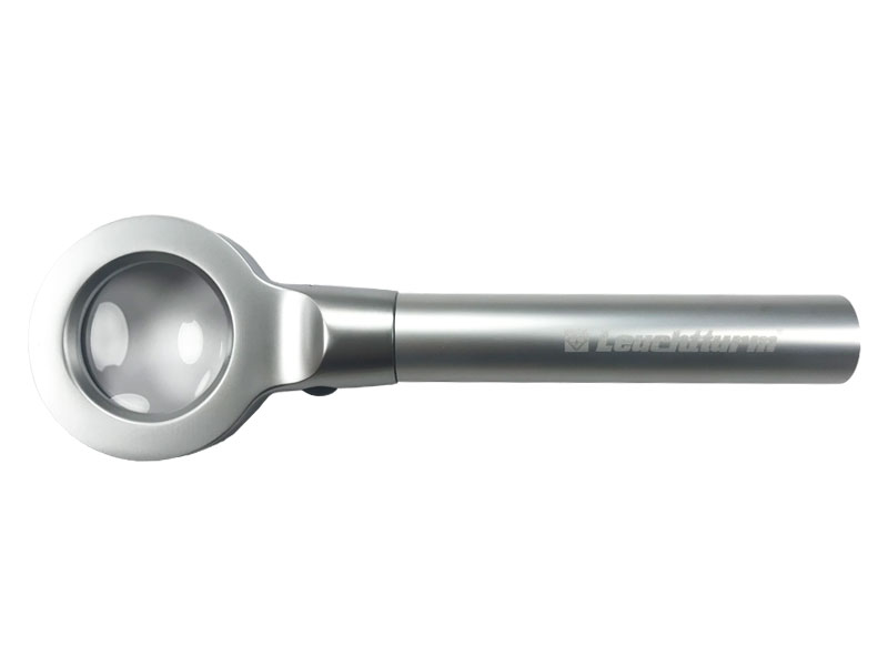 La lentille en verre permet un grossissement de 3.2. 6 diodes électroluminescentes (DEL) sont intégrées dans le cadre en aluminium, qui pourvoient un très bon éclairage des objets à observer.