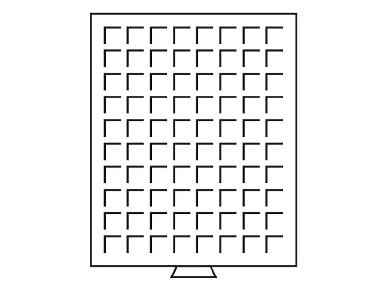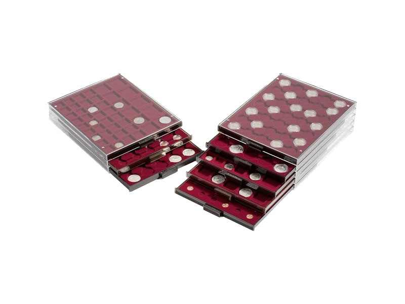 Tiroir teinte fumée, fond bordeaux avec 80 compartiments carrées.