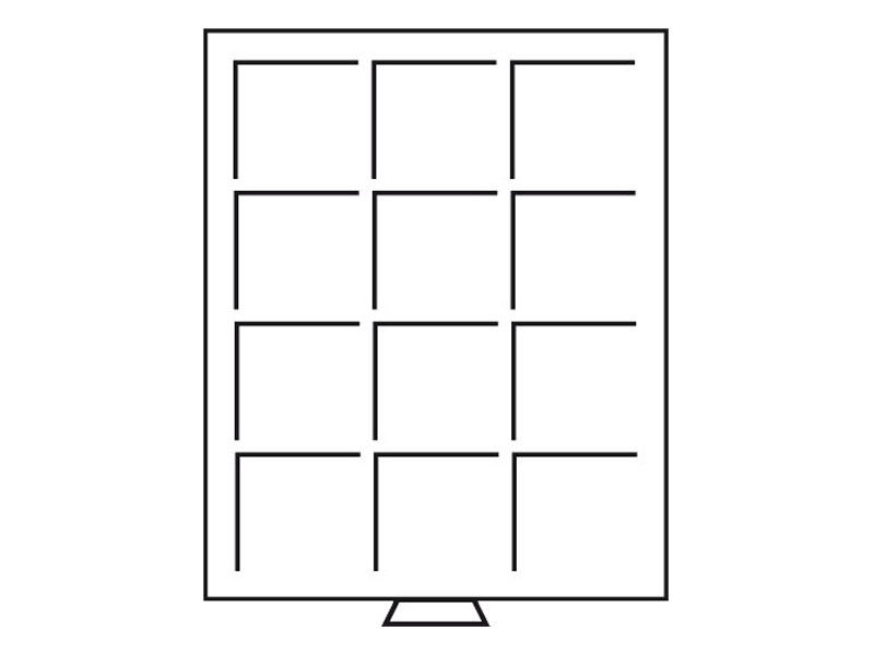 Tiroir teinte fumée, fond bordeaux avec 12 compartiments carrées.