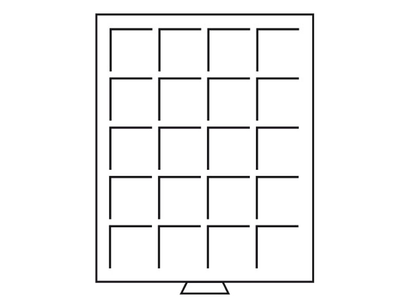 Tiroir teinte fumée, fond bordeaux avec 20 compartiments carrées.