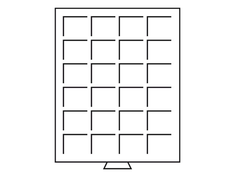 Tiroir teinte fumée, fond bordeaux avec 24 compartiments carrées.