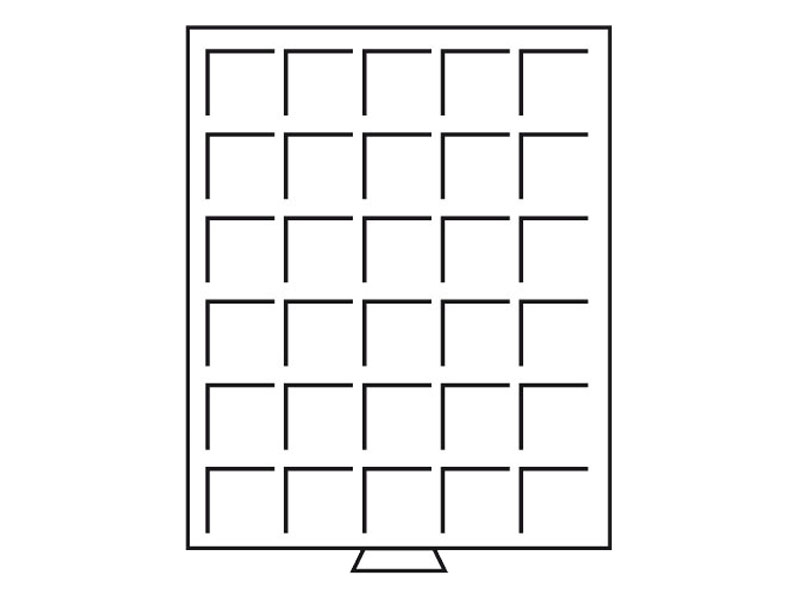 Tiroir teinte fumée, fond bordeaux avec 30 compartiments carrées.