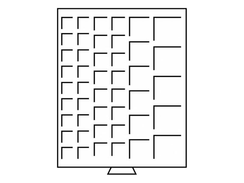 Tiroir teinte fumée, fond bordeaux avec 35 compartiments carrées.