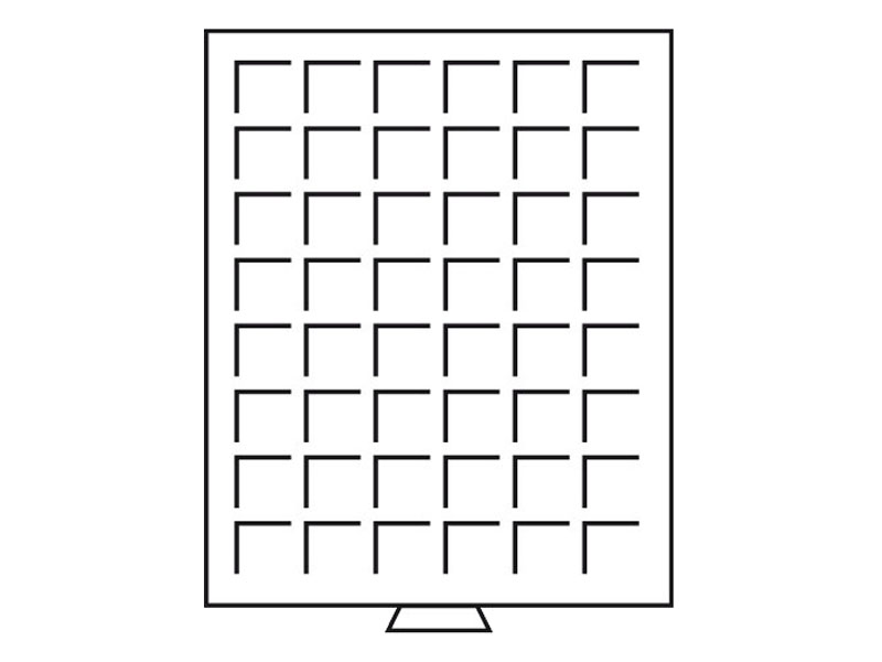 Tiroir teinte fumée, fond bordeaux avec 48 compartiments carrées.