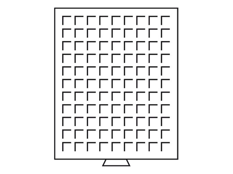 Tiroir teinte fumée, fond bordeaux avec 99 compartiments carrées.