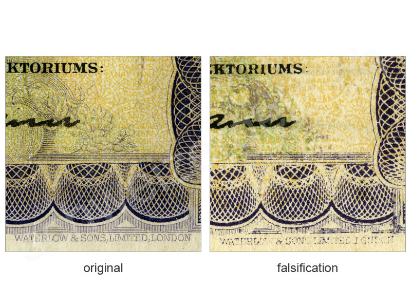 Spécificité: indication de l'imprimeur (WATERLOW & SONS) en bas à droite n'est pas lisible entièrement