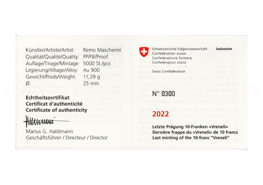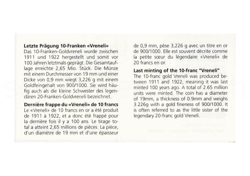 100 year anniversary of the last minting of the 10-franc Vreneli