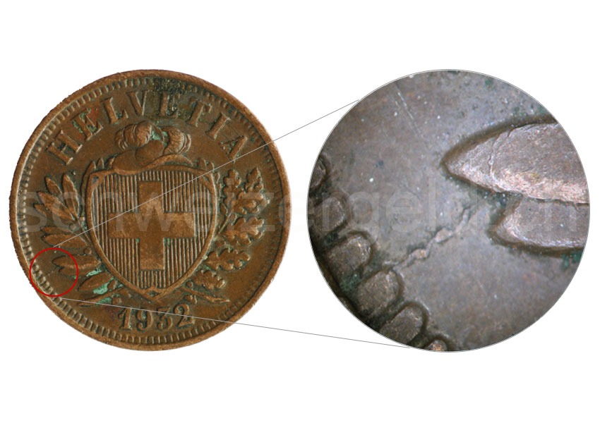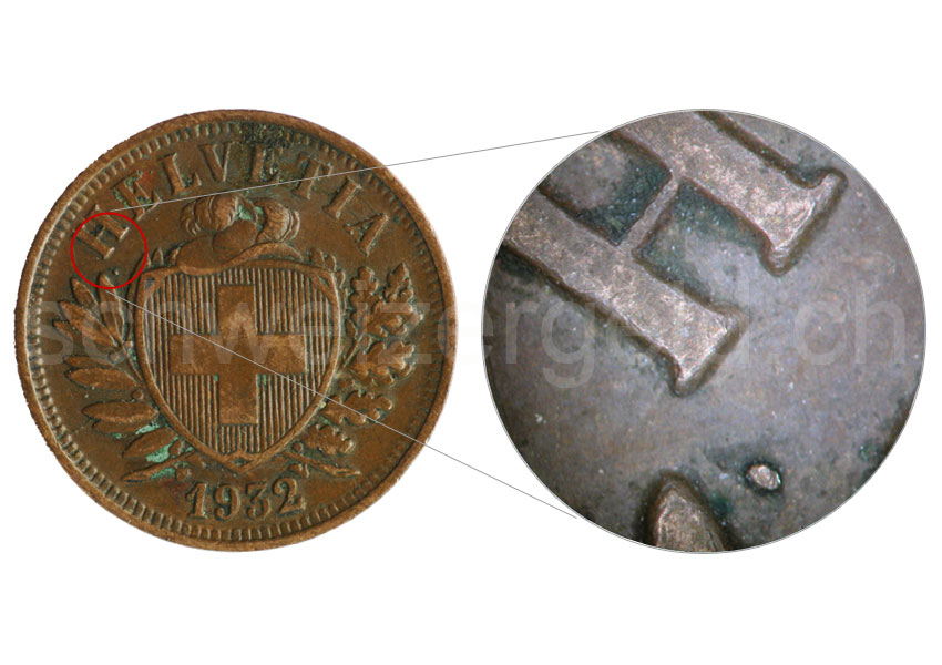 2 centimes piece with two varieties on one coin: One additional point between shield and H plus a die scratch on the illustrated side.